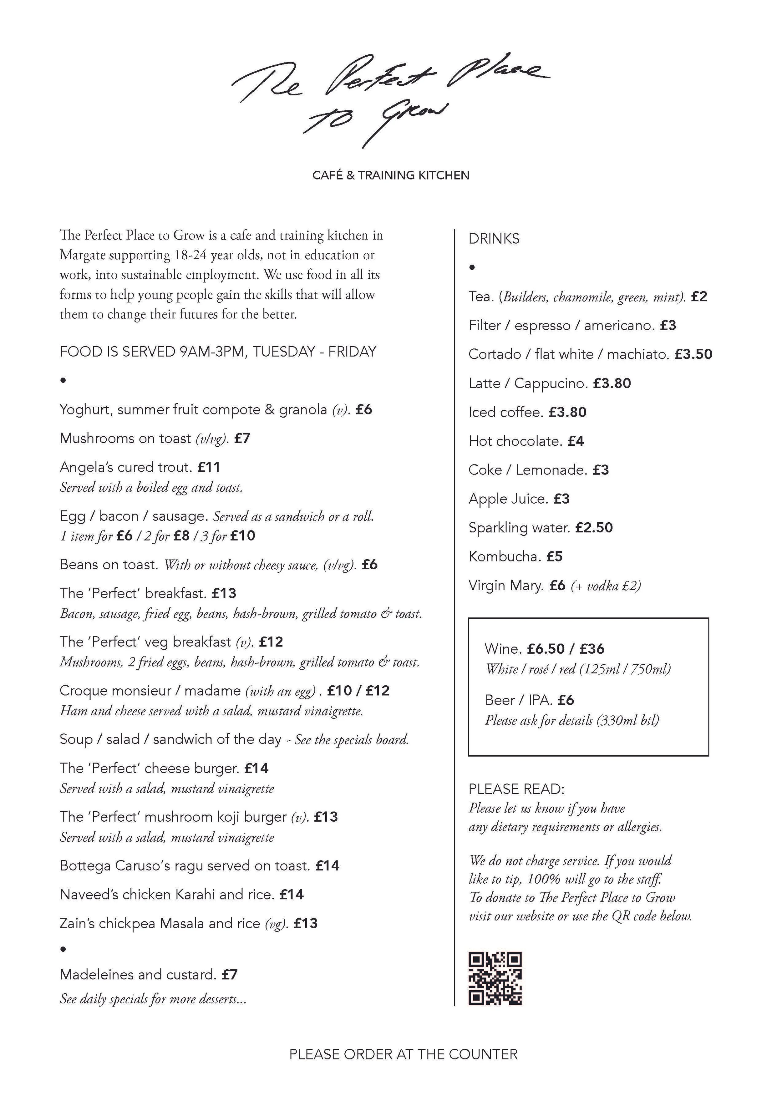 Our training café can be found on the site of the Tracey Emin Foundation. We gratefully sit in the small red brick building beyond the gates. We rely on our community near and far to support what we do by visiting us and trying the dishes we’ve made with the trainees. Our regular daily menu can be seen below. But depending on the seasons or which guest-chef we have supporting us that week, we will have various specials on the board.
